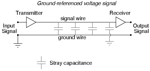 A robust alternative to the common ground signal method is the differential voltage method, where each bit is represented by the difference of voltage between a ground-isolated pair of wires, instead of a voltage between one wire and a common ground. This tends to limit the capacitive and inductive effects imposed upon each signal and the tendency for the signals to be corrupted due to outside electrical interference, thereby significantly improving the practical distance of a serial network: