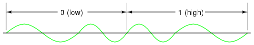 However, a large part of the problem with digital network signals is the square-wave nature of such voltages, as was previously mentioned. If only we could avoid square waves all together, we could avoid many of their inherent difficulties in long, high-frequency networks. One way of doing this is to modulate a sine wave voltage signal with our digital data. "Modulation" means that magnitude of one signal has control over some aspect of another signal. Radio technology has incorporated modulation for decades now, in allowing an audio-frequency voltage signal to control either the amplitude (AM) or frequency (FM) of a much higher frequency "carrier" voltage, which is then send to the antenna for transmission. The frequency-modulation (FM) technique has found more use in digital networks than amplitude-modulation (AM), except that its referred to as Frequency Shift Keying (FSK). With simple FSK, sine waves of two distinct frequencies are used to represent the two binary states, 1 and 0: