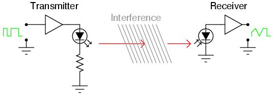 Transmitting digital information in optical form may be done in open air, simply by aiming a laser at a photodetector at a remote distance, but interference with the beam in the form of temperature inversion layers, dust, rain, fog, and other obstructions can present significant engineering problems: