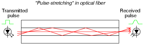 A light pulse emitted by the LED taking a shorter path through the fiber will arrive at the detector sooner than light pulses taking longer paths. The result is distortion of the square-wave's rising and falling edges, called pulse stretching. This problem becomes worse as the overall fiber length is increased: