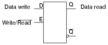A very simple type of electronic memory is the bistable multivibrator. Capable of storing a single bit of data, it is volatile (requiring power to maintain its memory) and very fast. The D-latch is probably the simplest implementation of a bistable multivibrator for memory usage, the D input serving as the data "write" input, the Q output serving as the "read" output, and the enable input serving as the read/write control line: