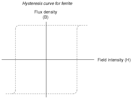 Shown on a graph with the strength of the applied magnetic field on the horizontal axis (field intensity), and the actual magnetization (orientation of electron spins in the ferrite material) on the vertical axis (flux density), ferrite won't become magnetized one direction until the applied field exceeds a critical threshold value. Once that critical value is exceeded, the electrons in the ferrite "snap" into magnetic alignment and the ferrite becomes magnetized. If the applied field is then turned off, the ferrite maintains full magnetism. To magnetize the ferrite in the other direction (polarity), the applied magnetic field must exceed the critical value in the opposite direction. Once that critical value is exceeded, the electrons in the ferrite "snap" into magnetic alignment in the opposite direction. Once again, if the applied field is then turned off, the ferrite maintains full magnetism. To put it simply, the magnetization of a piece of ferrite is "bistable."