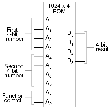 The usefulness of a look-up table becomes more and more evident with increasing complexity of function. Suppose we wanted to build a 4-bit adder circuit using a ROM. We'd require a ROM with 8 address lines (two 4-bit numbers to be added together), plus 4 data lines (for the signed output):