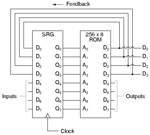 Here, the D0 through D3 data outputs are used exclusively for feedback to the A0 through A3 address lines. Date output lines D4 through D7 can be programmed to output something other than the FSM's "state" value. Being that four data output bits are being fed back to four address bits, this is still a 16-state device. However, having the output data come from other data output lines gives the programmer more freedom to configure functions than before. In other words, this device can do far more than just count! The programmed output of this FSM is dependent not only upon the state of the feedback address lines (A0 through A3), but also the states of the input lines (A4 through A7). The D-type flip/flop's clock signal input does not have to come from a pulse generator, either. To make things more interesting, the flip/flop could be wired up to clock on some external event, so that the FSM goes to the next state only when an input signal tells it to.