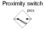 Proximity switches sense the approach of a metallic machine part either by a magnetic or high-frequency electromagnetic field. Simple proximity switches use a permanent magnet to actuate a sealed switch mechanism whenever the machine part gets close (typically 1 inch or less). More complex proximity switches work like a metal detector, energizing a coil of wire with a high-frequency current, and electronically monitoring the magnitude of that current. If a metallic part (not necessarily magnetic) gets close enough to the coil, the current will increase, and trip the monitoring circuit. The symbol shown here for the proximity switch is of the electronic variety, as indicated by the diamond-shaped box surrounding the switch. A non-electronic proximity switch would use the same symbol as the lever-actuated limit switch.