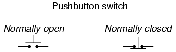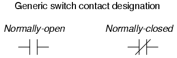 There is also a generic symbology for any switch contact, using a pair of vertical lines to represent the contact points in a switch. Normally-open contacts are designated by the lines not touching, while normally-closed contacts are designated with a diagonal line bridging between the two lines. Compare the two: