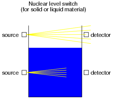 Another type of level switch, suitable for liquid or solid material detection, is the nuclear switch. Composed of a radioactive source material and a radiation detector, the two are mounted across the diameter of a storage vessel for either solid or liquid material. Any height of material beyond the level of the source/detector arrangement will attenuate the strength of radiation reaching the detector. This decrease in radiation at the detector can be used to trigger a relay mechanism to provide a switch contact for measurement, alarm point, or even control of the vessel level.
