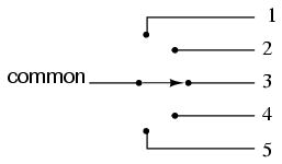 The selector switch shown above switches a common contact lever to one of five different positions, to contact wires numbered 1 through 5. The most common configuration of a multi-position switch like this is one where the contact with one position is broken before the contact with the next position is made. This configuration is called break-before-make. To give an example, if the switch were set at position number 3 and slowly turned clockwise, the contact lever would move off of the number 3 position, opening that circuit, move to a position between number 3 and number 4 (both circuit paths open), and then touch position number 4, closing that circuit.