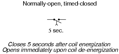 First we have the normally-open, timed-closed (NOTC) contact. This type of contact is normally open when the coil is unpowered (de-energized). The contact is closed by the application of power to the relay coil, but only after the coil has been continuously powered for the specified amount of time. In other words, the direction of the contact's motion (either to close or to open) is identical to a regular NO contact, but there is a delay in closing direction. Because the delay occurs in the direction of coil energization, this type of contact is alternatively known as a normally-open, on-delay: