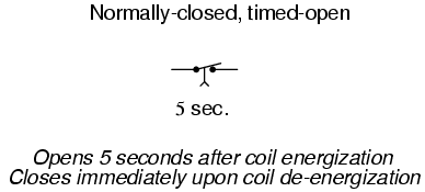Next we have the normally-closed, timed-open (NCTO) contact. This type of contact is normally closed when the coil is unpowered (de-energized). The contact is opened with the application of power to the relay coil, but only after the coil has been continuously powered for the specified amount of time. In other words, the direction of the contact's motion (either to close or to open) is identical to a regular NC contact, but there is a delay in the opening direction. Because the delay occurs in the direction of coil energization, this type of contact is alternatively known as a normally-closed, on-delay: