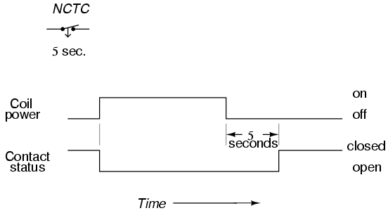 Finally we have the normally-closed, timed-closed (NCTC) contact. Like the NCTO contact, this type of contact is normally closed when the coil is unpowered (de-energized), and opened by the application of power to the relay coil. However, unlike the NCTO contact, the timing action occurs upon de-energization of the coil rather than upon energization. Because the delay occurs in the direction of coil de-energization, this type of contact is alternatively known as a normally-closed, off-delay:
