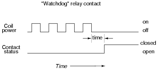 The "watchdog" timer is especially useful for monitoring of computer systems. If a computer is being used to control a critical process, it is usually recommended to have an automatic alarm to detect computer "lockup" (an abnormal halting of program execution due to any number of causes). An easy way to set up such a monitoring system is to have the computer regularly energize and de-energize the coil of a watchdog timer relay (similar to the output of the "recycle" timer). If the computer execution halts for any reason, the signal it outputs to the watchdog relay coil will stop cycling and freeze in one or the other state. A short time thereafter, the watchdog relay will "time out" and signal a problem.