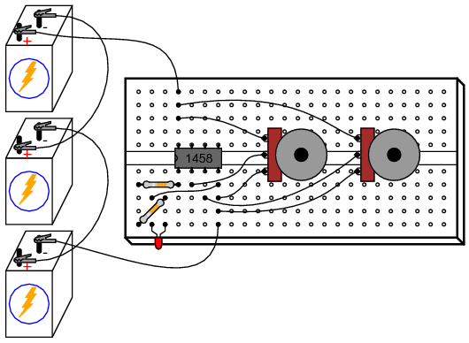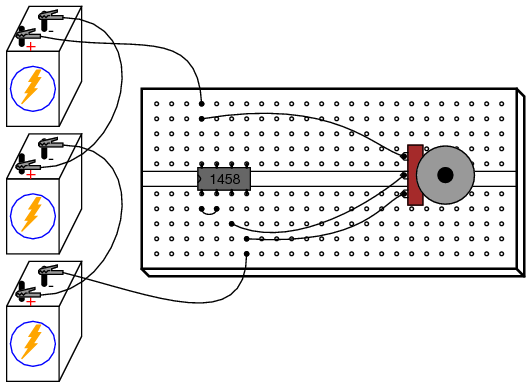 After you've proven this circuit to work, modify it by changing the power supply from dual to split. This entails removing the center-tap ground connection between the 2nd and 3rd batteries, and grounding the far negative battery terminal instead: