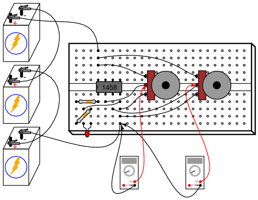 This meter experiment is based on a JFET-input op-amp such as the TL082. The other op-amp (model 1458) is used in this experiment to demonstrate the absence of latch-up: a problem inherent to the TL082.