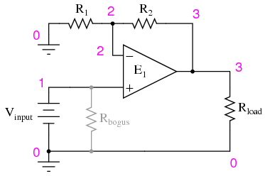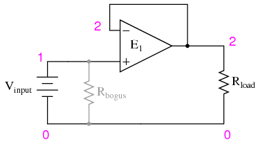 Because SPICE views the input impedance of a dependent source as infinite, some finite amount of resistance must be included to avoid an analysis error. This is the purpose of Rbogus: to provide DC path to ground for the Vinput voltage source. Such "bogus" resistances should be arbitrarily large. In this simulation I chose 1 MΩ for an Rbogus value.