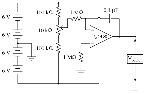 As you can see from the schematic diagram, the potentiometer is connected to the "rails" of the power source through 100 kΩ resistors, one on each end. This is to limit the span of the potentiometer, so that full movement produces a fairly small range of input voltages for the op-amp to operate on. At one extreme of the potentiometer's motion, a voltage of about 0.5 volt (with respect the the ground point in the middle of the series battery string) will be produced at the potentiometer wiper. At the other extreme of motion, a voltage of about -0.5 volt will be produced. When the potentiometer is positioned dead-center, the wiper voltage should measure zero volts.
