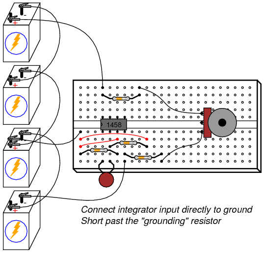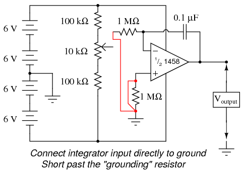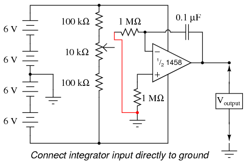 With the integrator input still shorted to ground, short past the 1 MΩ resistor connecting the op-amp's noninverting (+) input to ground. There should be no need for this resistor in an ideal op-amp circuit, so by shorting past it we will see what function it provides in this very real op-amp circuit:
