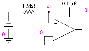 DC integrator vinput 1 0 dc 0.05 r1 1 2 1meg c1 2 3 0.1u ic=0 e1 3 0 0 2 999k .tran 1 30 uic .plot tran v(1,0) v(3,0) .end