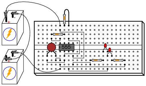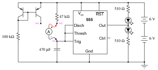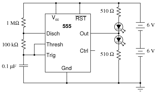 The "555" integrated circuit is a general-purpose timer useful for a variety of functions. In this experiment, we explore its use as an astable multivibrator, or oscillator. Connected to a capacitor and two resistors as shown, it will oscillate freely, driving the LEDs on and off with a square-wave output voltage.