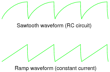 By connecting TP1 to TP2, the capacitor receives a nearly constant charging current. Constant capacitor charging current yields a voltage curve that is linear, as described by the equation i = C(de/dt). If the capacitor's current is constant, so will be its rate-of-change of voltage over time. The result is a "ramp" waveform rather than a "sawtooth" waveform:
