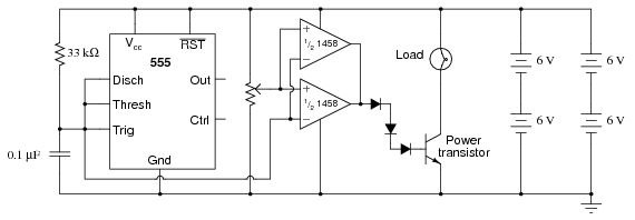 This circuit uses a 555 timer to generate a sawtooth voltage waveform across a capacitor, then compares that signal against a steady voltage provided by a potentiometer, using an op-amp as a comparator. The comparison of these two voltage signals produces a square-wave output from the op-amp, varying in duty cycle according to the potentiometer's position. This variable duty cycle signal then drives the base of a power transistor, switching current on and off through the load. The 555's oscillation frequency is much higher than the lamp filament's ability to thermally cycle (heat and cool), so any variation in duty cycle, or pulse width, has the effect of controlling the total power dissipated by the load over time.