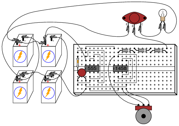 PWM is a concept easier understood through experimentation than reading. It would be nice to view the capacitor voltage, potentiometer voltage, and op-amp output waveforms all on one (triple-trace) oscilloscope to see how they relate to one another, and to the load power. However, most of us have no access to a triple-trace oscilloscope, much less any oscilloscope at all, so an alternative method is to slow the 555 oscillator down enough that the three voltages may be compared with a simple DC voltmeter. Replace the 0.1 µF capacitor with one that is 100 µF or larger. This will slow the oscillation frequency down by a factor of at least a thousand, enabling you to measure the capacitor voltage slowly rise over time, and the op-amp output transition from "high" to "low" when the capacitor voltage becomes greater than the potentiometer voltage. With such a slow oscillation frequency, the load power will not be proportioned as before. Rather, the lamp will turn on and off at regular intervals. Feel free to experiment with other capacitor or resistor values to speed up the oscillations enough so the lamp never fully turns on or off, but is "throttled" by quick on-and-off pulsing of the transistor.