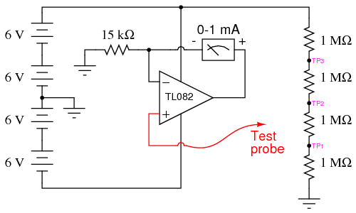 You may witness the extreme sensitivity of this voltmeter by touching the test probe with one hand and the most positive battery terminal with the other. Notice how you can drive the needle upward on the scale simply by measuring battery voltage through your body resistance: an impossible feat with the original, unamplified voltmeter circuit. If you touch the test probe to ground, the meter should read exactly 0 volts.