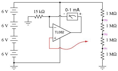 If you were to build a simple 0-15 volt range voltmeter by connecting the 1 mA meter movement in series with the 15 kΩ precision resistor, and try to use this voltmeter to measure the voltages at TP1, TP2, or TP3 (with respect to ground), you'd encounter severe measurement errors induced by meter "impact:"