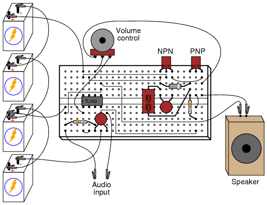 This amplifier circuit also works well in amplifying "line-level" audio signals from high-quality, modular stereo components. It provides a surprising amount of sound power when played through a large speaker, and may be run without heat sinks on the transistors (though you should experiment with it a bit before deciding to forego heat sinks, as the power dissipation varies according to the type of speaker used).