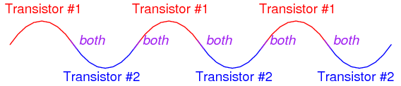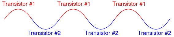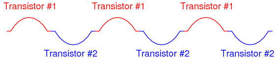 In a push-pull amplifier circuit, the two transistors take turns amplifying the alternate half-cycles of the waveform like this: