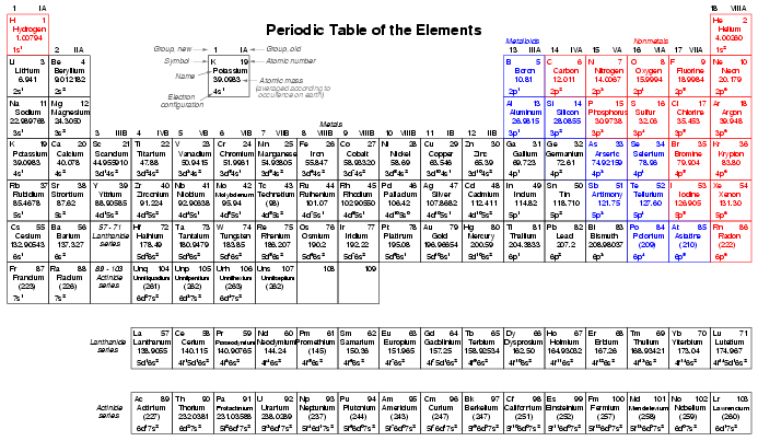 Electron configuration data was taken from Douglas C. Giancoli's Physics, 3rd edition. Average atomic masses were taken from Kenneth W. Whitten's, Kenneth D. Gailey's, and Raymond E. Davis' General Chemistry, 3rd edition. In the latter book, the masses were specified as 1985 IUPAC values.