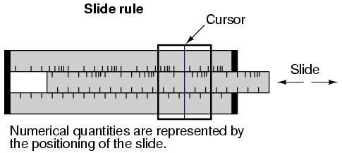 Marks on a slide rule's scales are spaced in a logarithmic fashion, so that a linear positioning of the scale or cursor results in a nonlinear indication as read on the scale(s). Adding or subtracting lengths on these logarithmic scales results in an indication equivalent to the product or quotient, respectively, of those lengths.
