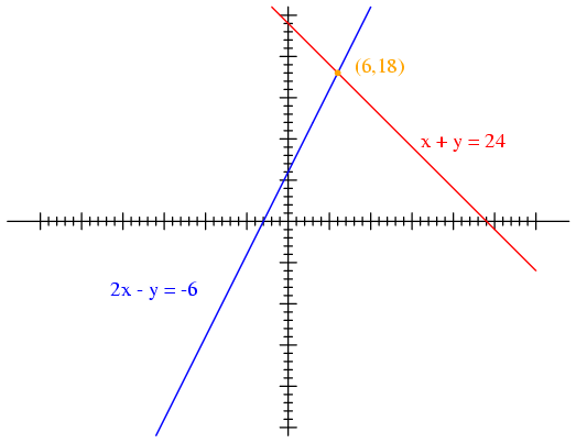 Each line is actually a continuum of points representing possible x and y solution pairs for each equation. Each equation, separately, has an infinite number of ordered pair (x,y) solutions. There is only one point where the two linear functions x + y = 24 and 2x - y = -6 intersect (where one of their many independent solutions happen to work for both equations), and that is where x is equal to a value of 6 and y is equal to a value of 18.