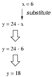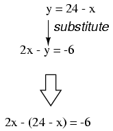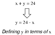 Then, we take this new definition of one variable and substitute it for the same variable in the other equation. In this case, we take the definition of y, which is 24 - x and substitute this for the y term found in the other equation: