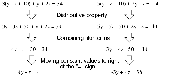 Using this solution technique on a three-variable system is a bit more complex. As with substitution, you must use this technique to reduce the three-equation system of three variables down to two equations with two variables, then apply it again to obtain a single equation with one unknown variable. To demonstrate, I'll use the three-variable equation system from the substitution section: