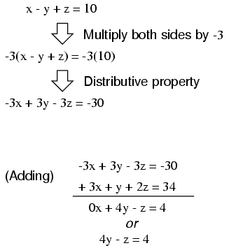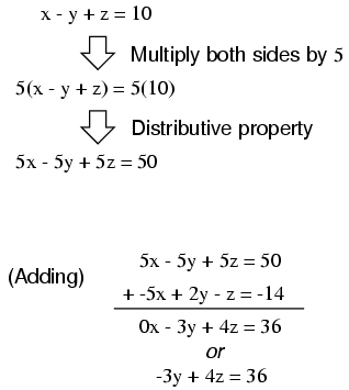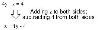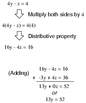 By inspection, it should be evident that the -z term of the upper equation could be leveraged to cancel the 4z term in the lower equation if only we multiply each term of the upper equation by 4 and add the two equations together: