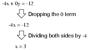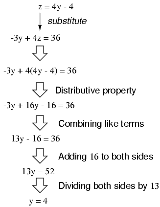 Taking the new equation 13y = 52 and solving for y (by dividing both sides by 13), we get a value of 4 for y. Substituting this value of 4 for y in either of the two-variable equations allows us to solve for z. Substituting both values of y and z into any one of the original, three-variable equations allows us to solve for x. The final result (I'll spare you the algebraic steps, since you should be familiar with them by now!) is that x = 2, y = 4, and z = 12.