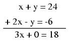 An option we have, then, is to add the corresponding sides of the equations together to form a new equation. Since each equation is an expression of equality (the same quantity on either side of the = sign), adding the left-hand side of one equation to the left-hand side of the other equation is valid so long as we add the two equations' right-hand sides together as well. In our example equation set, for instance, we may add x + y to 2x - y, and add 24 and -6 together as well to form a new equation. What benefit does this hold for us? Examine what happens when we do this to our example equation set: