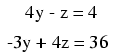 So far, our efforts have reduced the system from three variables in three equations to two variables in two equations. Now, we can apply the substitution technique again to the two equations 4y - z = 4 and -3y + 4z = 36 to solve for either y or z. First, I'll manipulate the first equation to define z in terms of y: