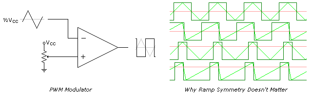 One of several ways PWM can be produced is by using a sawtooth waveform and a comparator. As shown below the sawtooth (or triangle wave) need not be symmetrical, but linearity of the waveform is important. The frequency of the sawtooth waveform is the sampling rate for the signal.