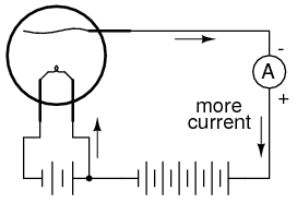 Sure enough, the presence of the battery created a much larger current from the filament to the metal strip. However, when the battery was turned around, there was little to no current at all!