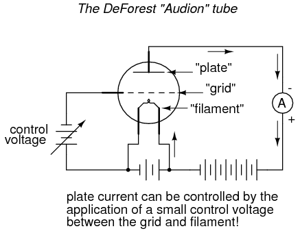 De Forest called this metal screen between filament and plate a grid. It wasn't just the amount of voltage between grid and filament that controlled current from filament to plate, it was the polarity as well. A negative voltage applied to the grid with respect to the filament would tend to choke off the natural flow of electrons, whereas a positive voltage would tend to enhance the flow. Although there was some amount of current through the grid, it was very small; much smaller than the current through the plate.