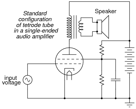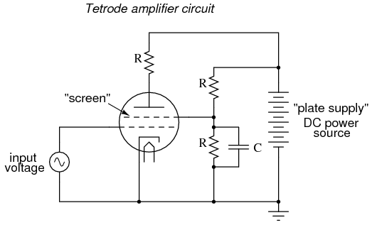 If we substitute a tetrode for a triode in this circuit, we will see improvements in circuit gain resulting from the electrostatic shielding offered by the screen, preventing unwanted feedback between the plate and control grid: