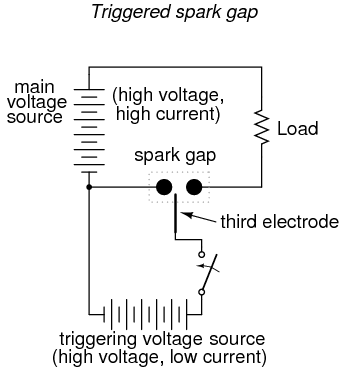 Spark gaps can be made to conduct on command by placing a third electrode (usually with a sharp edge or point) between the other two and applying a high voltage pulse between that electrode and one of the other electrodes. The pulse will create a small spark between the two electrodes, ionizing part of the pathway between the two large electrodes, and enabling conduction between them if the applied voltage is high enough: