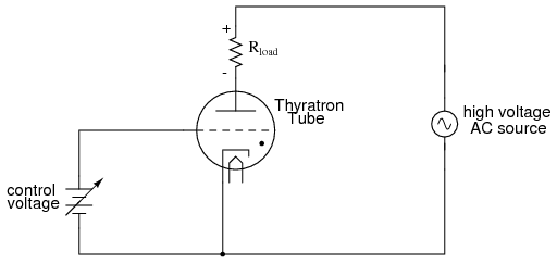Thyratrons found use in much the same way as SCR's find use today: controlling rectified AC to large loads such as motors. Thyratron tubes have been manufactured with different types of gas fillings for different characteristics: inert (chemically non-reactive) gas, hydrogen gas, and mercury (vaporized into a gas form when activated). Deuterium, a rare isotope of hydrogen, was used in some special applications requiring the switching of high voltages.