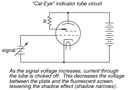 "Cat-eye" tubes were never accurate enough to be equipped with a graduated scale as is the case with CRT's and electromechanical meter movements, but they served well as null detectors in bridge circuits, and as signal strength indicators in radio tuning circuits. An unfortunate limitation to the "cat-eye" tube as a null detector was the fact that it was not directly capable of voltage indication in both polarities.