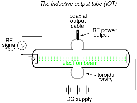 It was discovered in 1939 that a toroidal cavity made of conductive material called a cavity resonator surrounding an electron beam of oscillating intensity could extract power from the beam without actually intercepting the beam itself. The oscillating electric and magnetic fields associated with the beam "echoed" inside the cavity, in a manner similar to the sounds of traveling automobiles echoing in a roadside canyon, allowing radio-frequency energy to be transferred from the beam to a waveguide or coaxial cable connected to the resonator with a coupling loop. The tube was called an inductive output tube, or IOT: