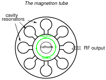 Magnetron tubes are representative of an entirely different kind of tube than the IOT and klystron. Whereas the latter tubes use a linear electron beam, the magnetron directs its electron beam in a circular pattern by means of a strong magnetic field: