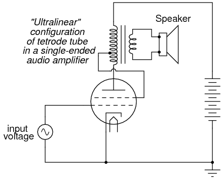 Enterprising electronics engineers also discovered ways to exploit such multi-variable capabilities of "lesser" tubes such as tetrodes and pentodes. One such way was the so-called ultralinear audio power amplifier, invented by a pair of engineers named Hafler and Keroes, utilizing a tetrode tube in combination with a "tapped" output transformer to provide substantial improvements in amplifier linearity (decreases in distortion levels). Consider a "single-ended" triode tube amplifier with an output transformer coupling power to the speaker: