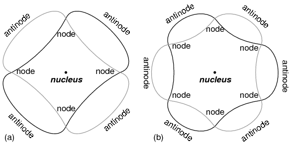 “Orbiting” electron as standing wave around the nucleus, (a) two cycles per orbit, (b) three cycles per orbit.